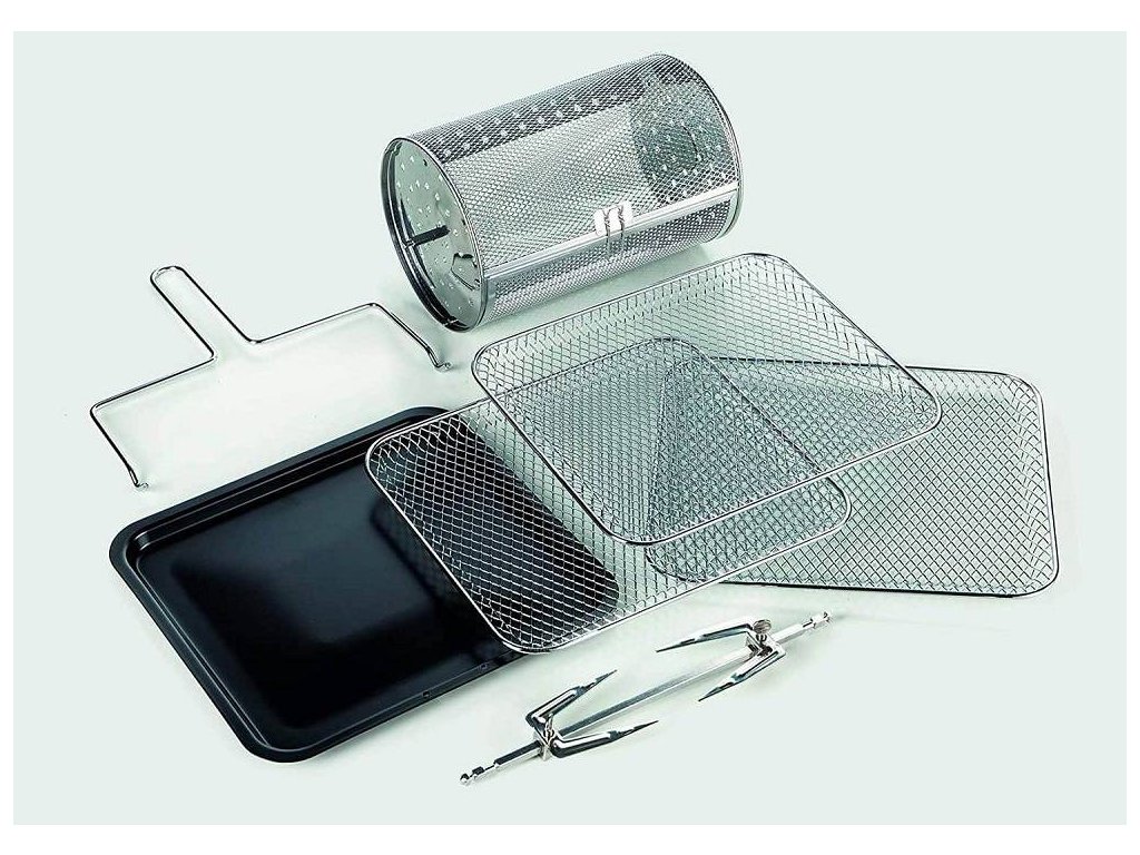 - Príslušenstvo: 3 grilovacie mriežky, pekáč, otočný ražeň, otočný kôš, rukoväť na vybratie koša