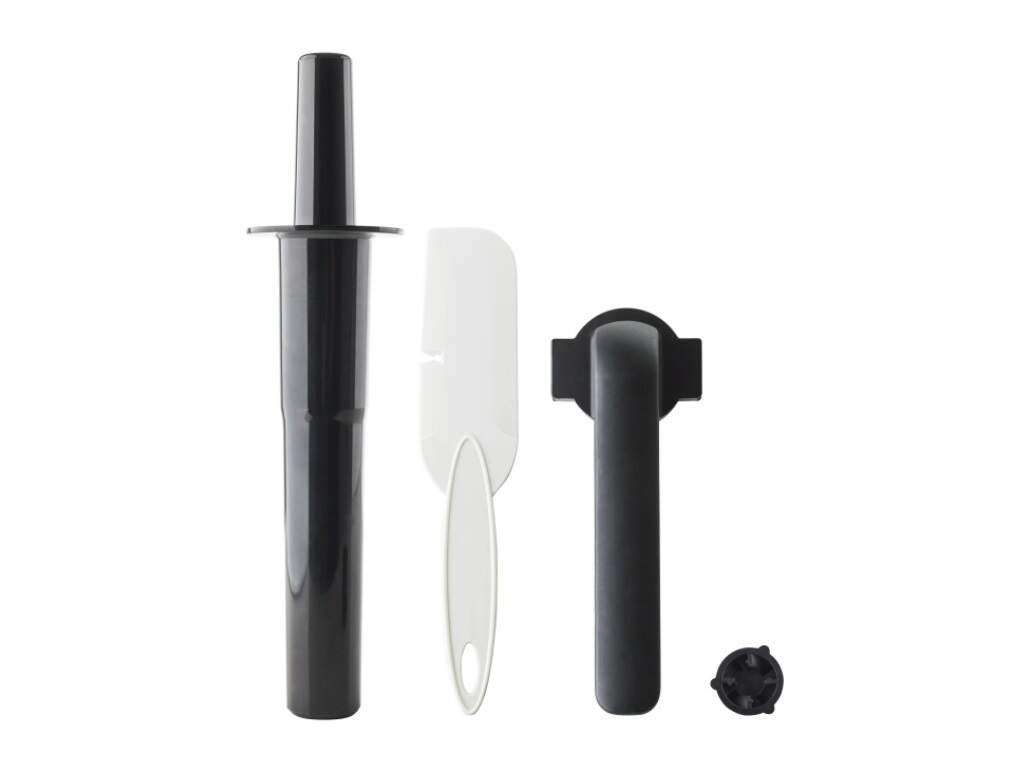 - Súčasťou balenia: nádobka 2,5 l, veko, malé viečko, plastová stierka, kľúč na utiahnutie noža, vtláčadlo