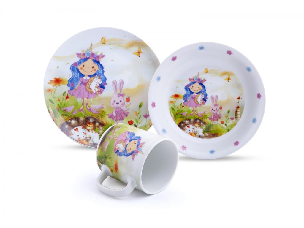 - Rozmer: tanier plytký Ø 21 cm, hrnček 225 ml, tanier hlboký Ø 19 cm