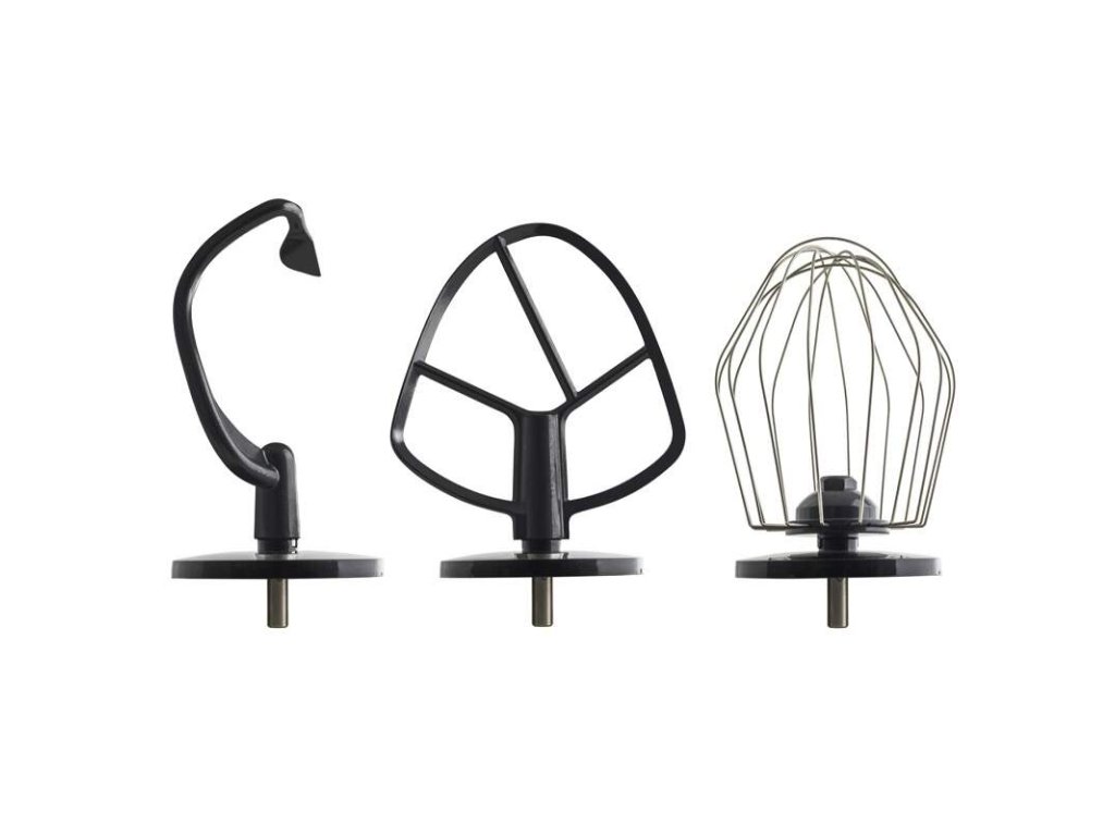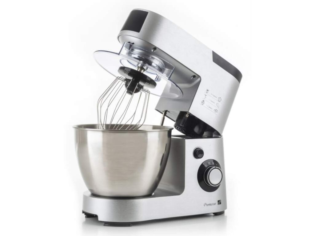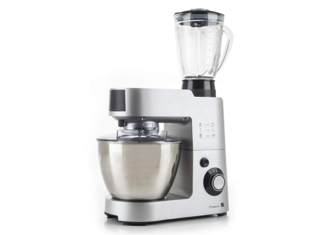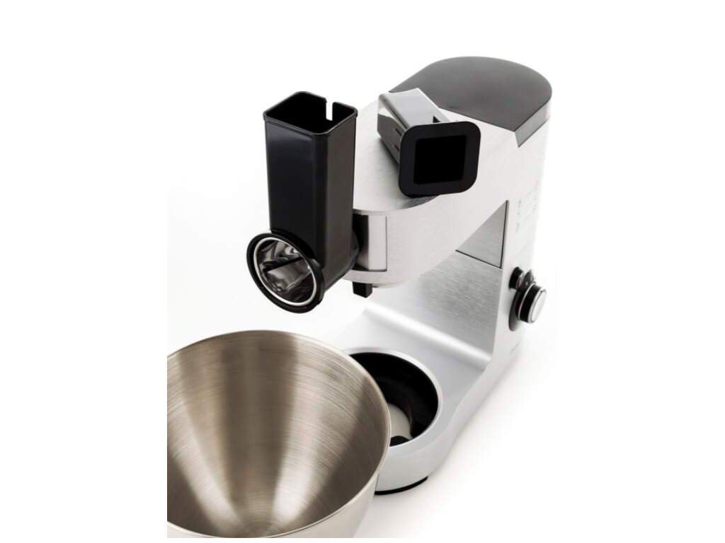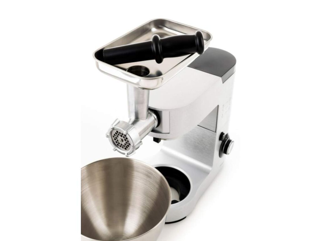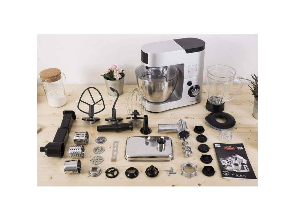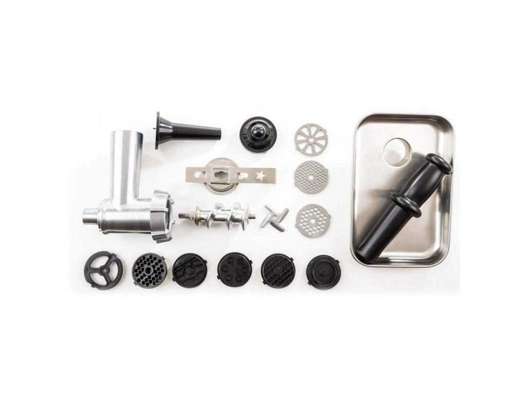 - Súčasťou balenia: nerezová misa s objemom 5,5 l, vrátane priehľadného krytu, hnetací hák, miešacia metla, šľahacia metla, mlynček na mäso , nadstavce na výrobu a plnenie klobás, nadstavce na výrobu cukroviniek, nadstavce na výrobu cestovín, nadstavec na strúhanie – 3 druhy strúhadiel , sklenený mixér 1,6 l