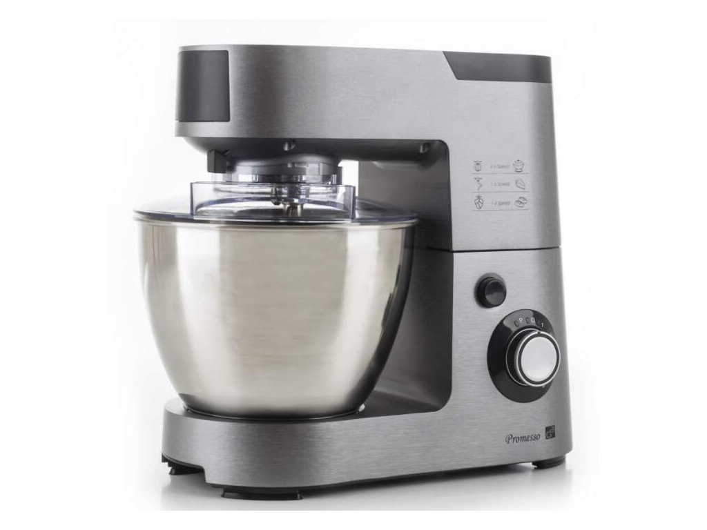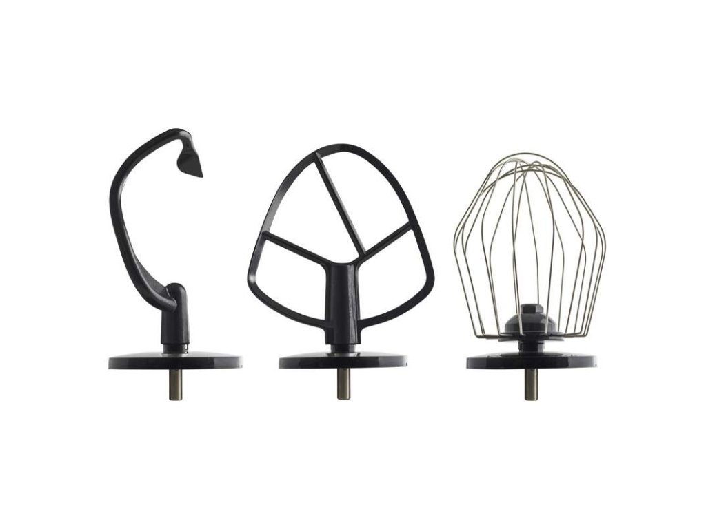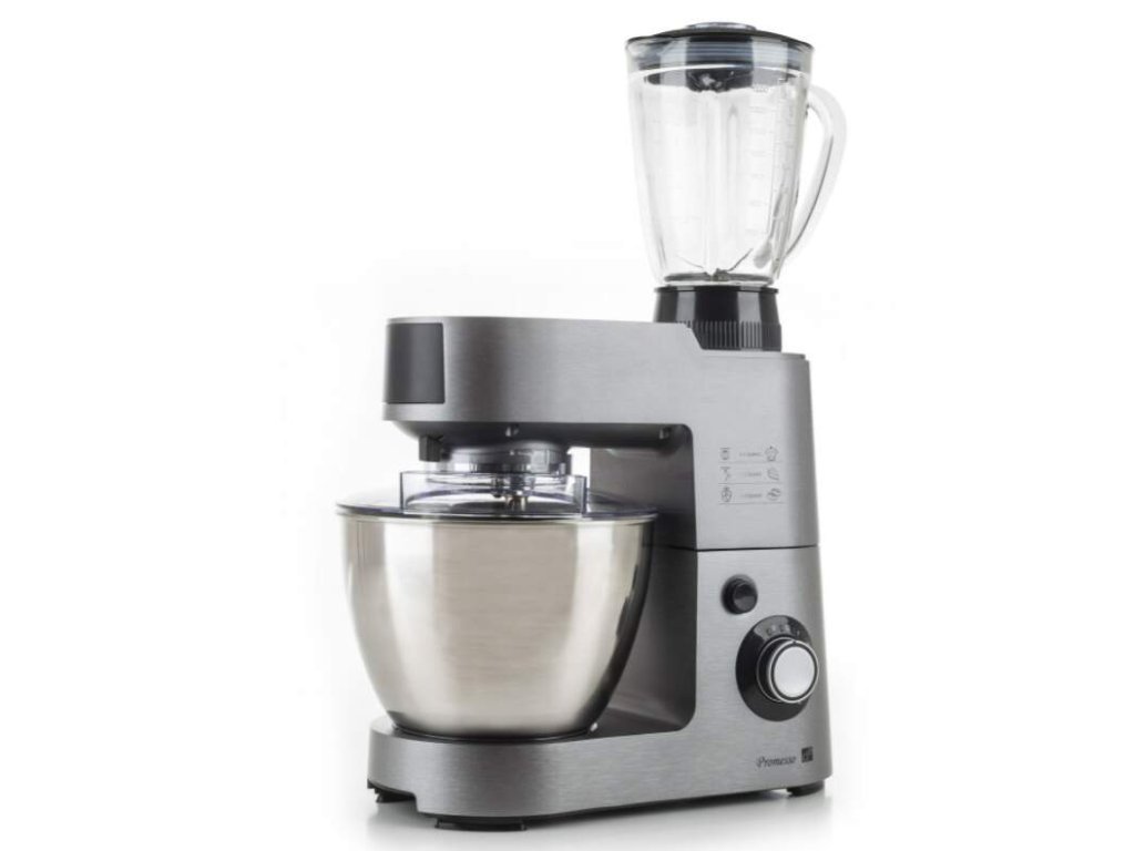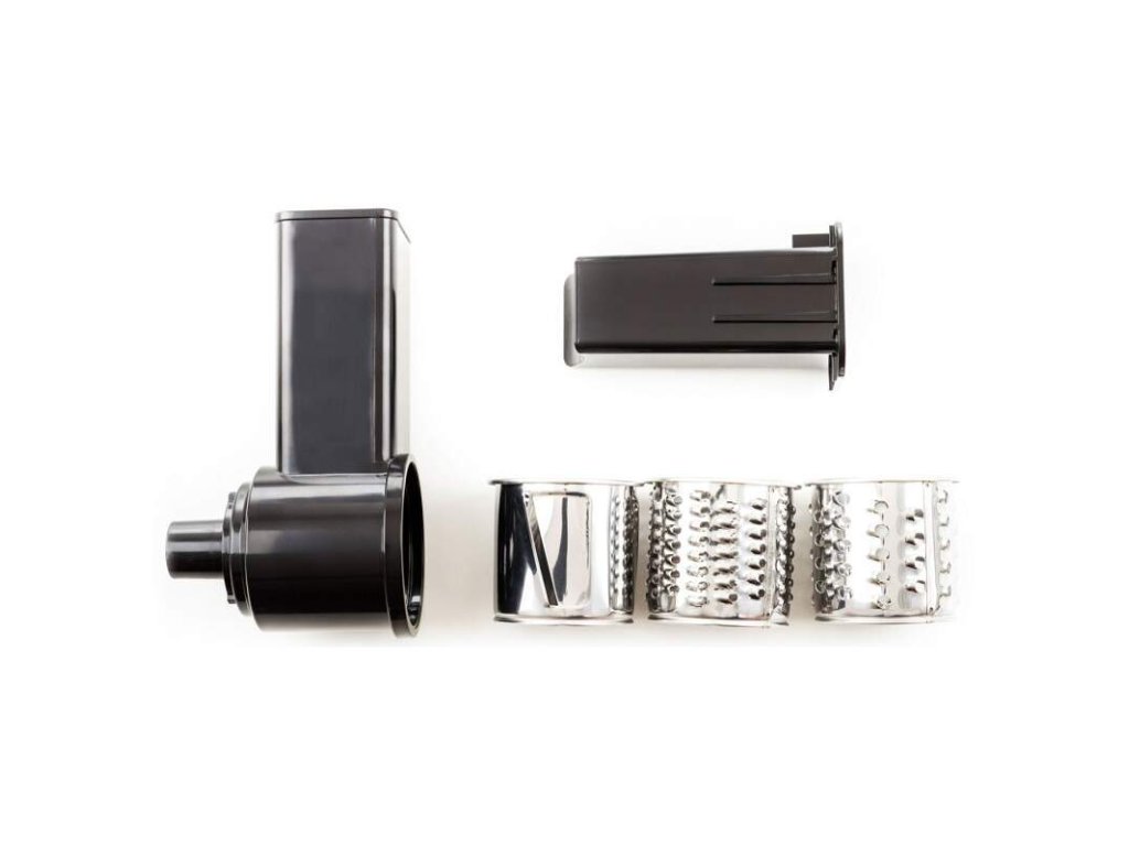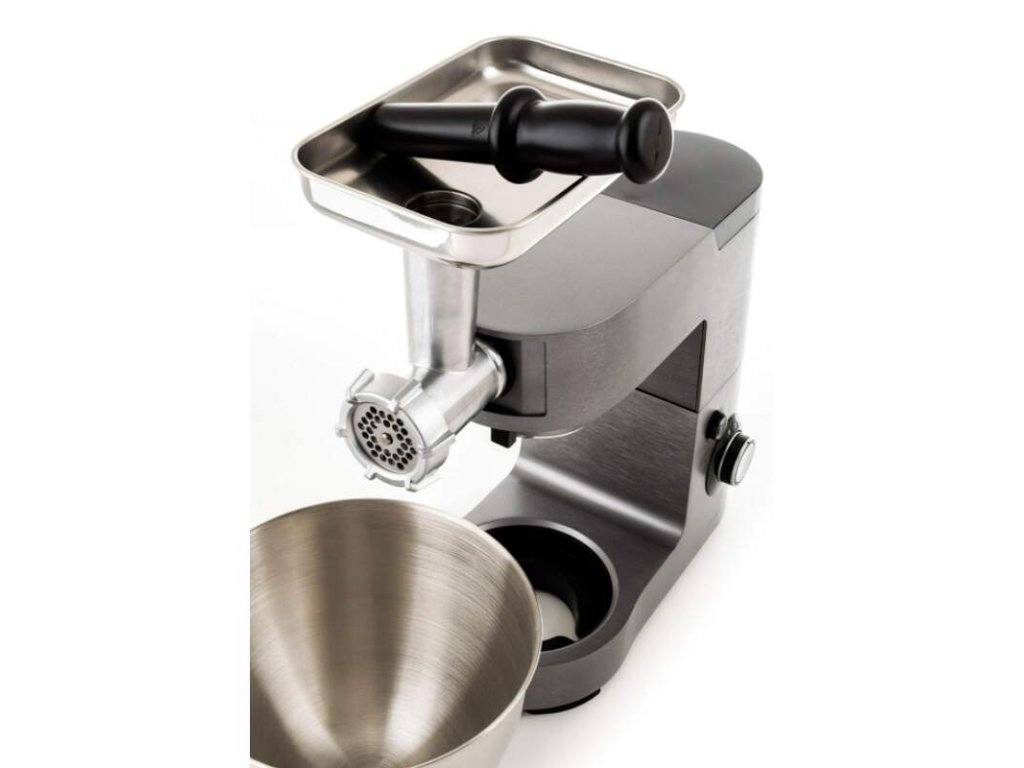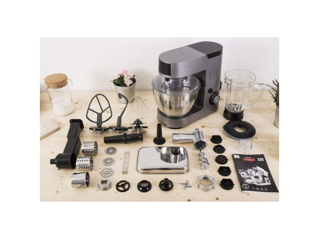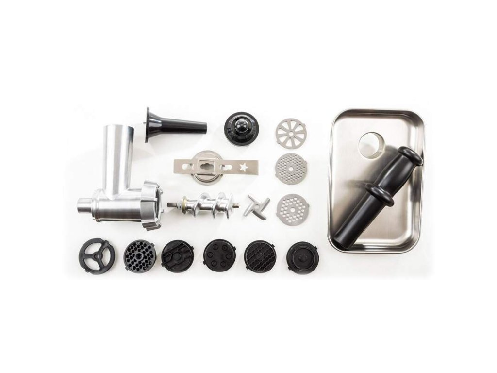 - Súčasťou balenia: nerezová misa s objemom 5,5 l, vrátane priehľadného krytu, hnetací hák, miešacia metla, šľahacia metla, mlynček na mäso , nadstavce na výrobu a plnenie klobás, nadstavce na výrobu cukroviniek, nadstavce na výrobu cestovín, nadstavec na strúhanie – 3 druhy strúhadiel , sklenený mixér 1,6 l