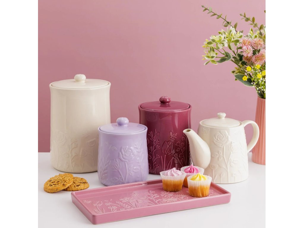 - Účel: veľká bielo glazovaná dóza na sušienky zdobená reliéfnym motívom kvitnúcich ruží a lúčnych kvetov