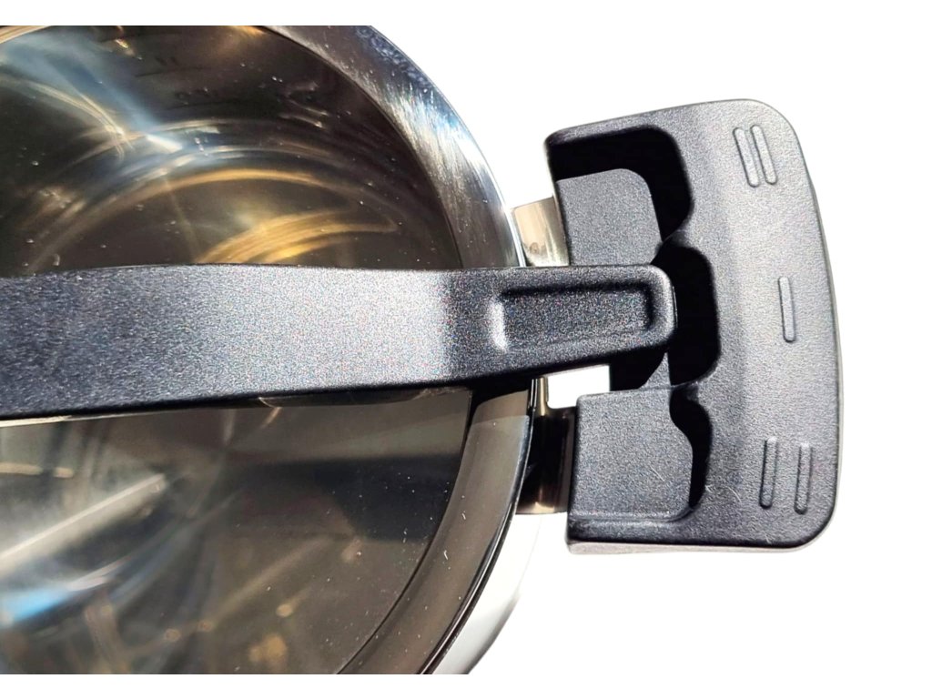 * odkladanie pokrievky do úchytov, para steká späť do riadu