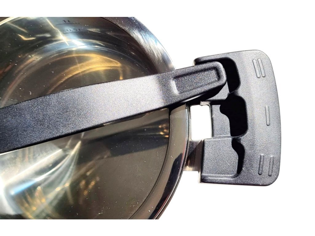 * odkladanie pokrievky do úchytov, para steká späť do riadu