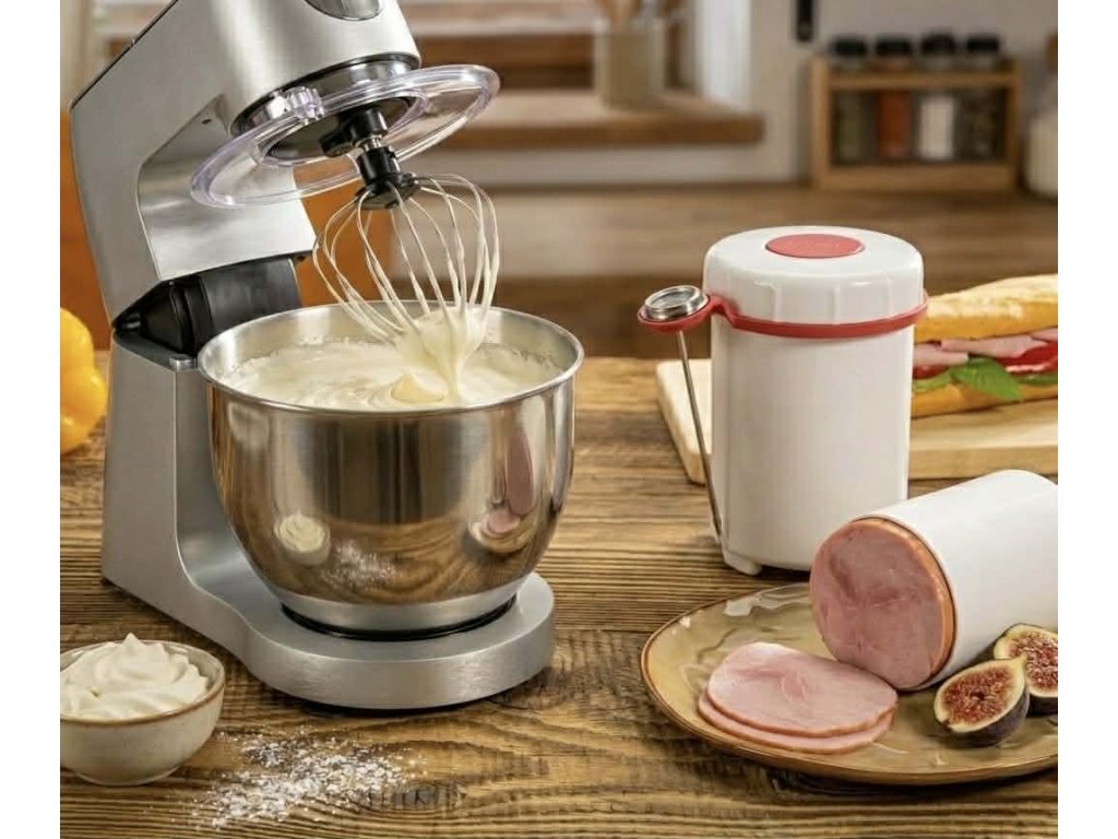 - súčasťou je tiež veľkokapacitná nerezová misa s objemom 6 litrov, v ktorej využijete kovovú metlu na miesenie, hák na hnetanie alebo nerezovú metlu na šlahanie