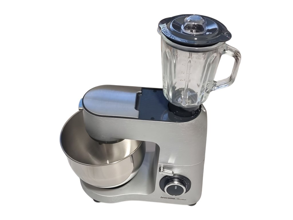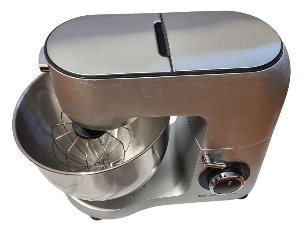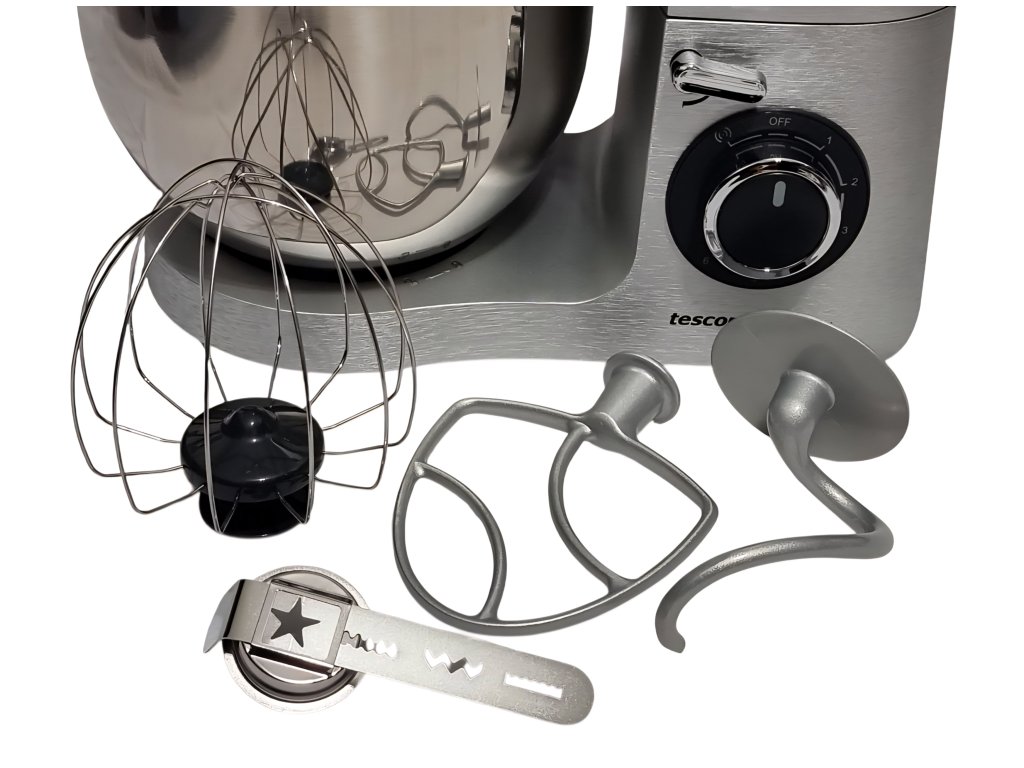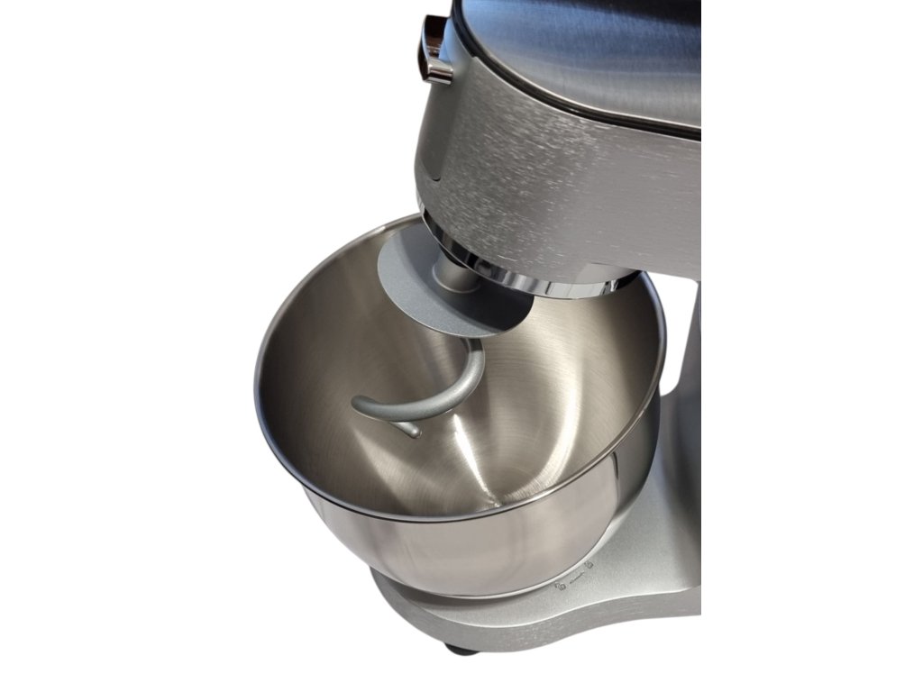 - súčasťou je tiež veľkokapacitná nerezová misa s objemom 6 litrov, v ktorej využijete kovovú metlu na miesenie, hák na hnetanie alebo nerezovú metlu na šlahanie