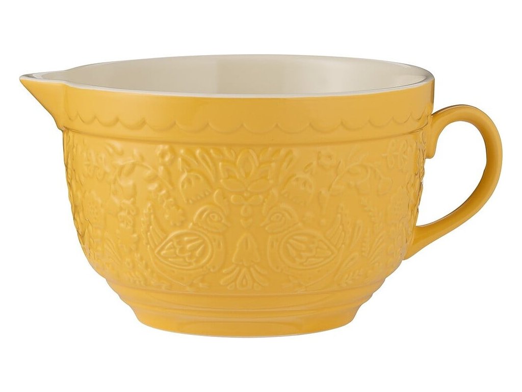 - Účel: misa z britskej kameniny s uchom a zlievacou hubičkou (batter bowl), v žltej farbe s motívom kohúta a sliepočky, ideálna na palacinkové cesto