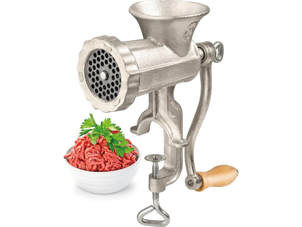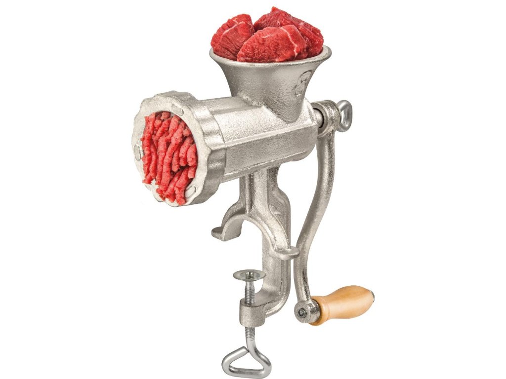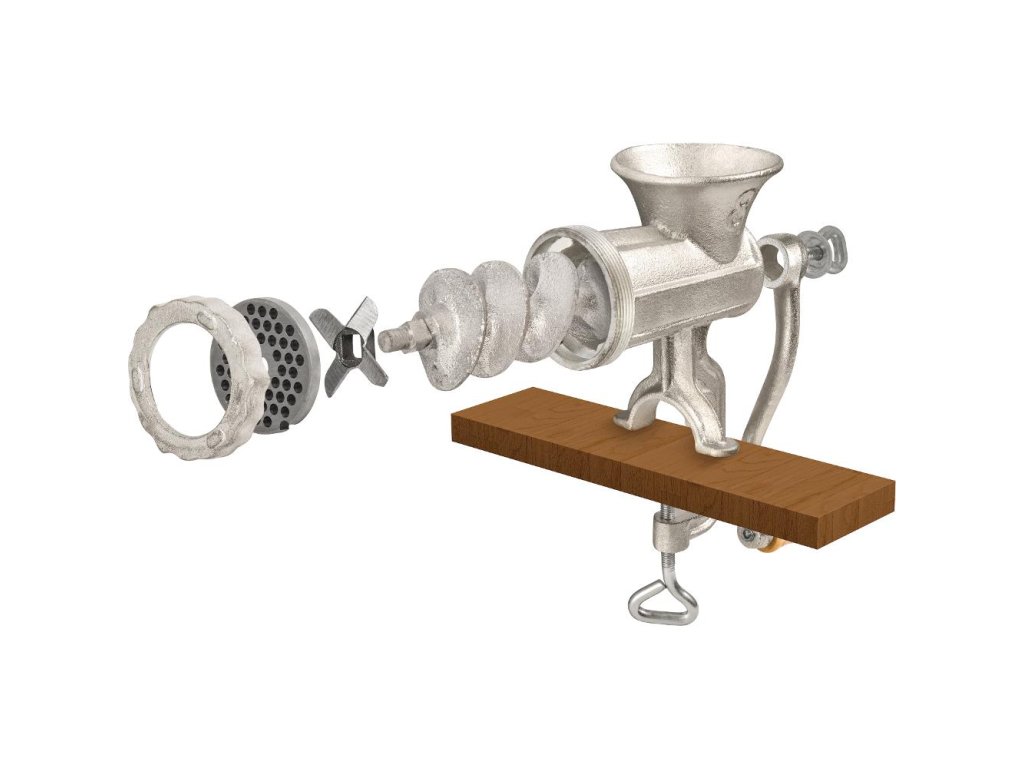 - Účel: mlynček na mäso s upínacím mechanizmom a dreveným držadlom kľučky