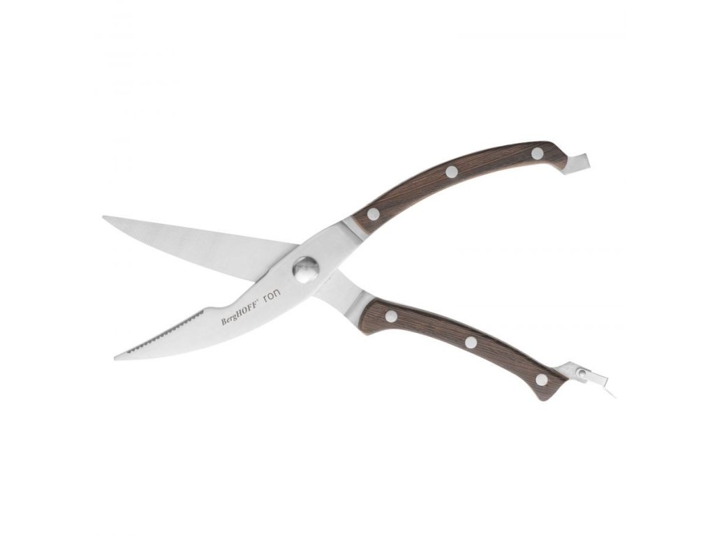 Robustné nožnice na hydinu s ostrou čepeľou. Vysoko kvalitná nerezová oceľ typu X20Cr13. Ostrie čepele brúsené laserom pre maximálnu ostrosť, nie je nutné často brúsiť. Drevená rukoväť s krásnou štruktúrou dodáva nožom a nožniciam z kolekcie RON luxusný vzhľad. Precízne spracovanie vhodné pre profesionálnych kuchárov i nadšencov v kuchyni. Pre vysoko kvalitné nože aj nožnice, obzvlášť s drevenou rukoväťou, je vždy odporúčané šetrné ručné umývanie, ktoré navyše dlhodobo zachová kvalitu ostria. Dĺžka: 25 cm a šírka: 5 cm