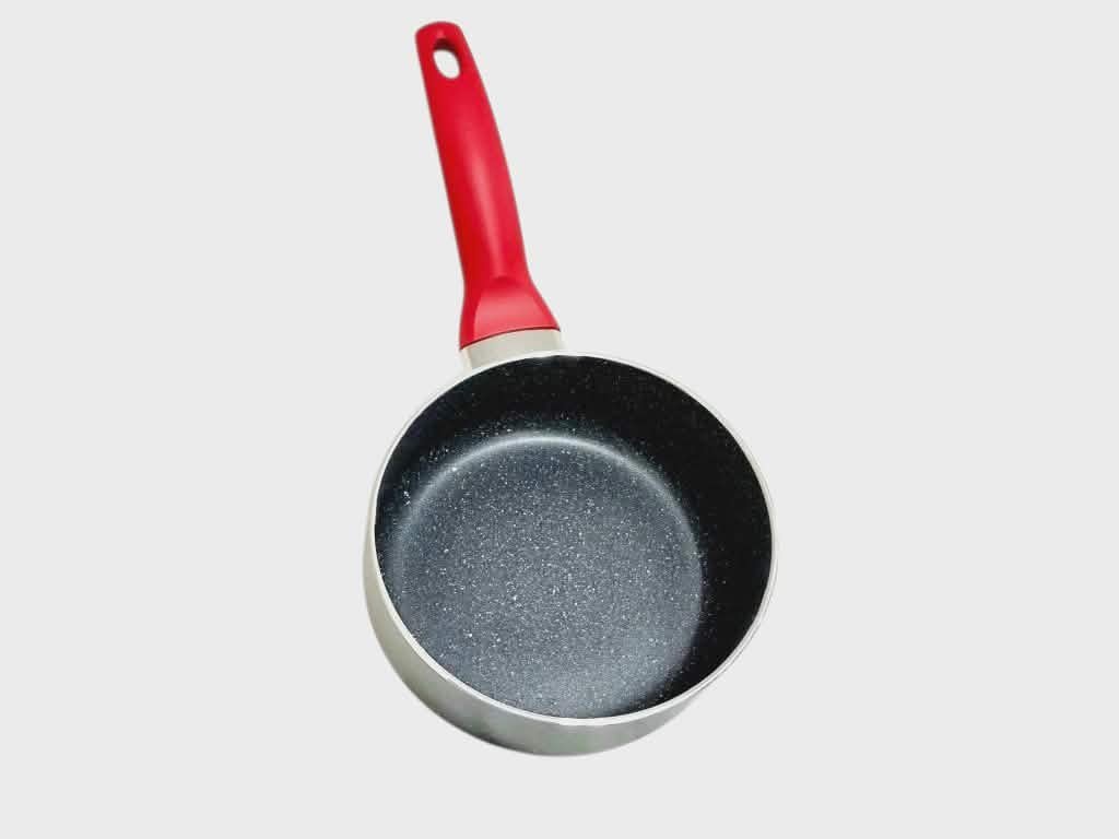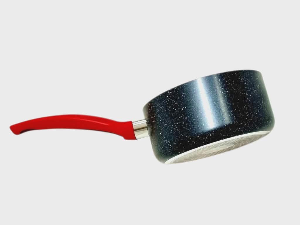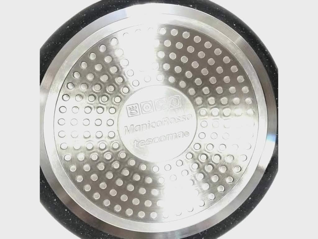 - Typ materiálu: indukčné dno z nehrdzavejúcej ocele, charakter lešteného prírodného kameňa a masívnu výraznú červenú rukoväť