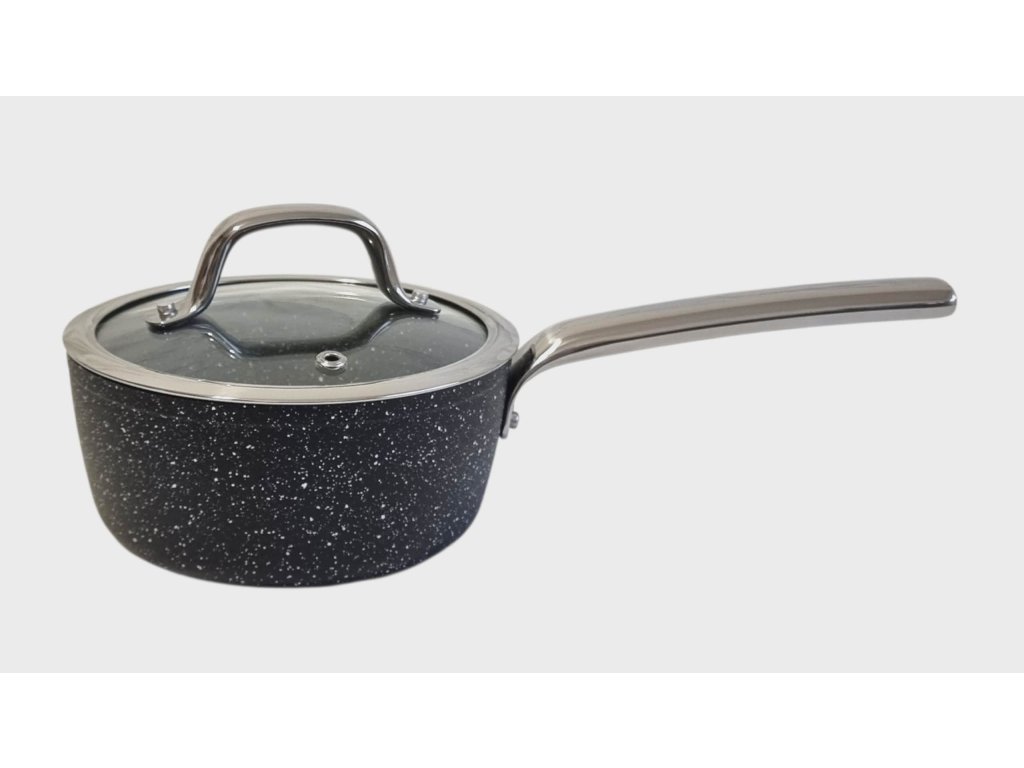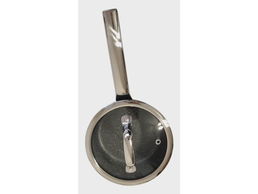 - Typ materiálu: prvotriedny antiadhézny povrch (vhodný tiež pre kovové kuchynské náradie), charakter nelešteného prírodného kameňa, sklonerezová pokrievka