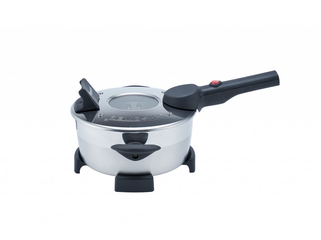 - Obsah balenia: veko na pečenie – vyrobené z antikorového plechu a so skleneným okienkom, sklenená pokrievka – z tvrdeného bezpečnostného skla a osadená plastovým držadlom, hrniec na pečenie – vďaka špeciálnemu 3-vrstvovému materiálu Trimetal je zaručená odolnosť výrobku aj rovnomerné rozloženie tepla, odnímateľný kábel – prívodný kábel s euro konektorom, stojan – praktický stojan pre Remosku vyrobený z tepelne odolného plastu