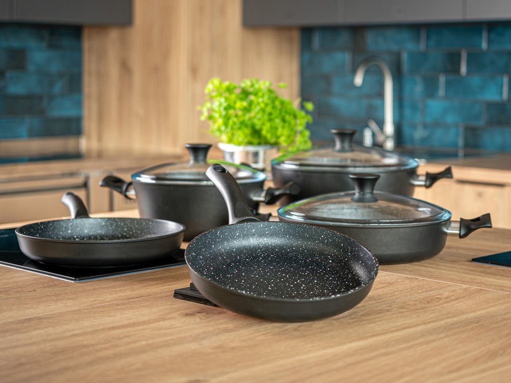 - Typ materiálu: pokrievka z borosilikátového skla - pre lepší odvod pary sú po okraji pokrievky integrované špeciálne výstupky, povrch - trojvrstvový nepriľnavý povrch Quantanium s časticami oxidu titánu