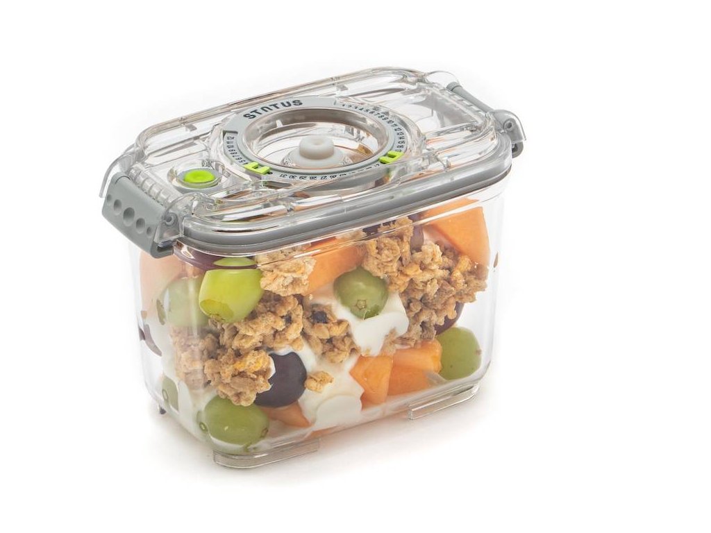 - Kľúčové vlastnosti: skvelé na marinovanie mäsa (vákuum otvára póry a marináda ľahšie a rýchlejšie preniká do hĺbky), manuálne nastavenie dátumu uloženia potravín – máte stály prehľad o čerstvosti potravín, zelený indikátor vákua pre rýchlu kontrolu odsatia vzduchu v nádobe, perfektné na krabičkovú diétu aj nosenie jedla do práce – všetko si pripravíte doma na niekoľko dní dopredu a máte 100% prehľad o nutričnej hodnote svojho jedla, vákuum predĺžuje životnosť potravín až 4-násobne (spomaľuje sa tvorba oxidácie, histamínu, množenie bakterií a plesní, zachovávajú sa vitamíny a minerály)