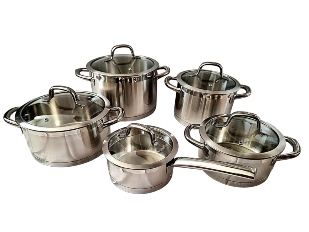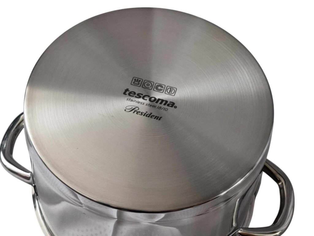 10 diela súprava PRESIDENT, extra silné sendvičové dno, materiál nehrdzavejúca oceľ. Pokrievky su sklonerezové a odmeriavacia stupnica uľahčuje dávkovanie jednotlivých ingrediencií.