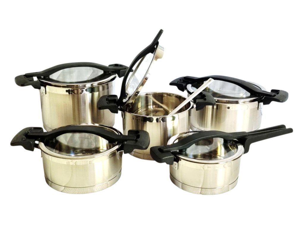 Luxusná súprava riadu od Tescomy, ktorá sa vyznačuje s revolučným systémom regulácie pary a cedenia. Extra silné sendvičové dno, materiál nehrdzavejúca oceľ.