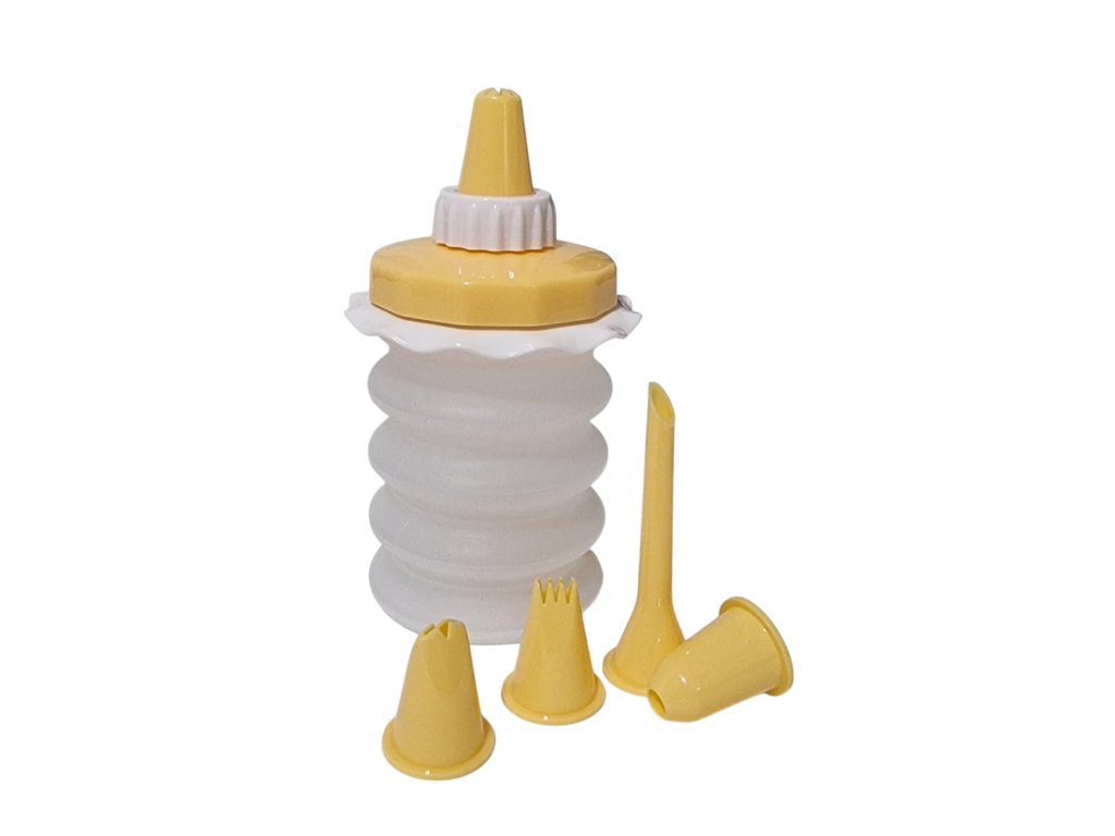 - Účel: jednoduché zdobenie sladkou alebo slanou náplňou, súprava obsahuje päť rôznych trysiek a krytku, s ktorou uschováte nespotrebovanú náplň. Telo zdobičky je z pružného silikónu, vďaka nemu máte vždy pod kontrolou množstvo vytlačenej náplne.
